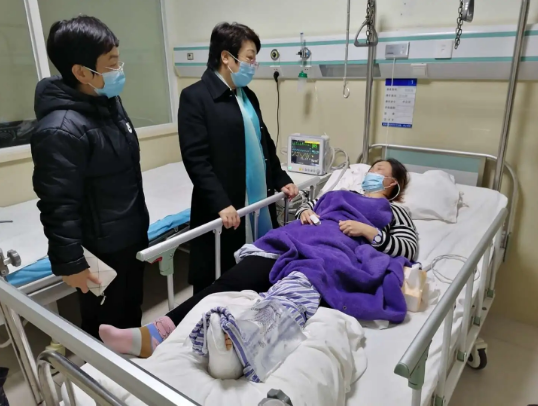 跌倒后,酒店管理人员将韩丽丽送往医院,诊断为脚踝骨折,躺在病床上的韩丽丽告诉我们,她的工作地点在黄区,负责背着消毒桶喷洒消毒液为往返隔离红区的防疫志愿者做“首消”,她每天穿着严严实实的防护服,带着口罩、护目镜,向红区志愿者的防护服和手套靴子上喷洒消毒液,还需要将志愿者从隔离区出来穿的靴子、手套浸泡在高浓度的84消毒液中,浸泡一小时后冲洗干净。进入黄区第二天她眼睛就严重的红肿,嗓子干哑。韩丽丽说:“当时部门负责人就劝我撤出来,我想再坚持一下,就告诉部门经理,我出不去,给我买点眼药水就行,我要是再不舒服我就出来”,就这样她一直坚持着,因为她一直记着上岗前一天丈夫嘱托她的话,“一定要用心、细心”。跌下楼梯不能动弹的时候,她最着急的就是 “完了,坚持不了了”。她现在最大的心愿就是赶紧好起来,不给单位添麻烦。